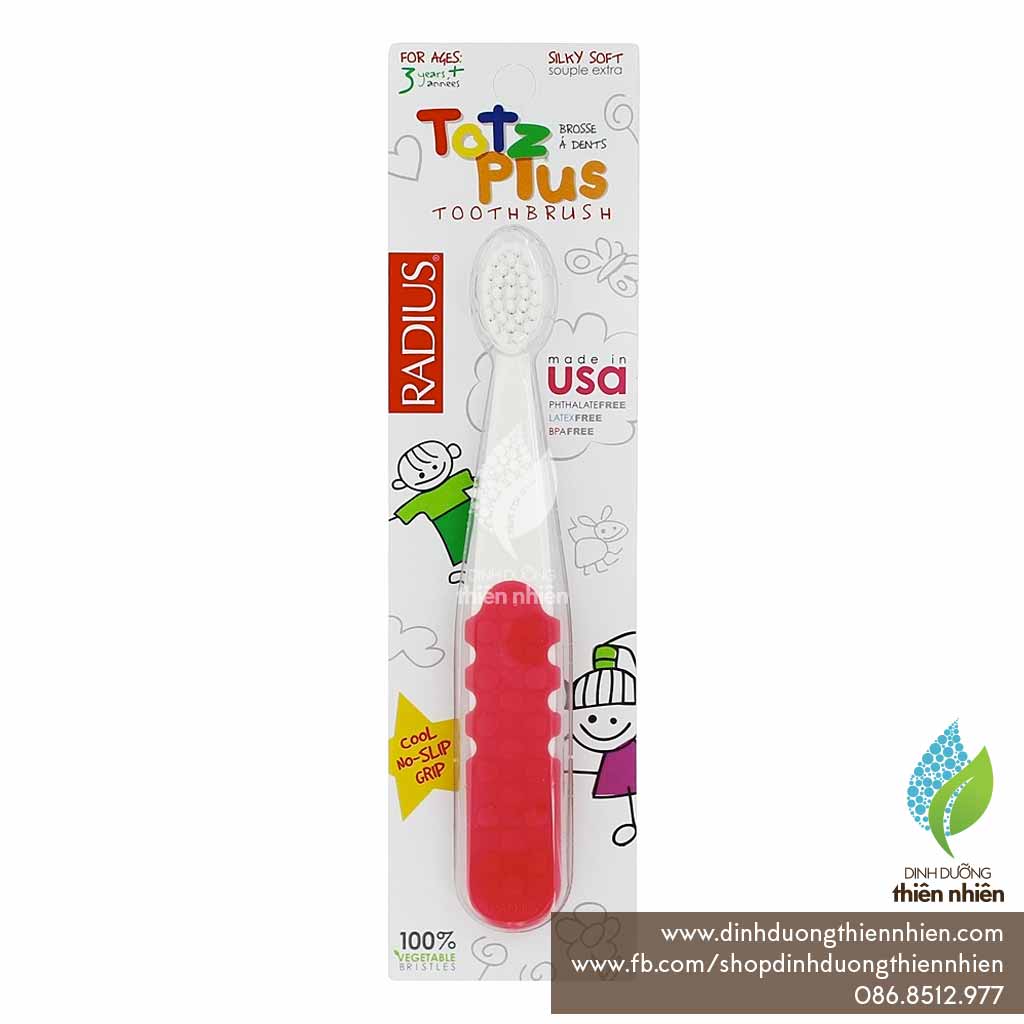 Bàn Chải Đánh Răng Lông Tròn Siêu Mềm Radius Totz Plus dành cho trẻ em trên 3 tuổi được thiết kế phù hợp cho răng và nướu nhỏ của trẻ, giúp trẻ có những trải nghiệm thoải mái với bài học đầu tiên trong việc chăm sóc răng miệng. Được giấy chứng nhận từ cơ quan Thực phẩm và Dược phẩm (FDA), công ty Radius cung cấp sự chăm sóc nhẹ nhàng nhưng an toàn, hiệu quả, không chứa những hóa chất độc hại như là BPA hoặc là màu nhân tạo. Với màu sắc tươi sang của mình, Bàn chải đánh răng Radius Totz Plus hoàn toàn có thể thu hút ánh nhìn của trẻ nhỏ. Được thiết kế với loại lông an toàn, kích thước phù hợp, lông mịn, loại lông tròn sẽ đảm bảo không gây hại đến nướu và răng của trẻ em nếu chải răng đúng cách. Radius sản xuất ra loại lông bàn chải đặc biệt phù hợp cho miệng nhạy cảm, lông bàn chải rất mềm, sẽ vô cùng phù hợp cho việc tập chải răng đúng cách cho miệng của trẻ nhỏ. Thiết kế được nghiên cứu để phù hợp với những phản hồi về nhu cầu của loại bàn chải phù hợp cho tay nhỏ. Bàn chải được thiết kế cho việc cầm nắm dễ dàng không một chút khó khăn ngay cả với bàn tay của trẻ nhỏ.