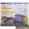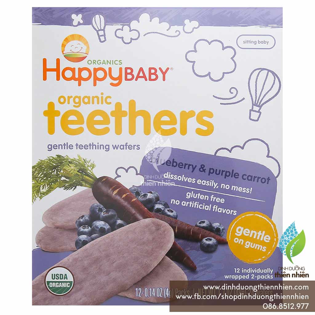Bánh ăn dặm hữu cơ vị việt quất (blueberry) và cà rốt tím với thành phần chứa: Bột gạo hoa nhài hữu cơ, tinh bột khoai mì hữu cơ, đường hữu cơ, bột quả việt quất hữu cơ, nước ép cà rốt tím hữu cơ, muối, tocopherols hỗn hợp (để giữ độ tươi).