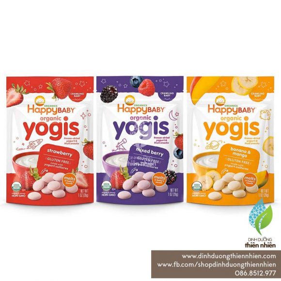 Bánh snack ăn dặm hữu cơ từ sữa chua đông lạnh sấy khô và trái cây của Happy Baby Organic Yogis có vị chua nhẹ của Yogurt (sữa chua) kết hợp với hương thơm từ trái cây, sau khi tan trong miệng còn có vị béo của sữa. Sản phẩm không chỉ giúp kích thích vị giác mà còn hỗ trợ đắc lực cho phát triển hệ tiêu hóa của bé.