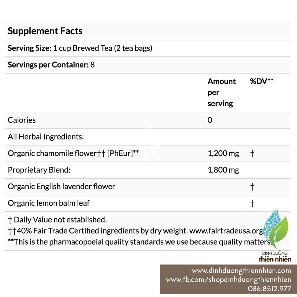 Lý do để yêu thích: Nhâm nhi một tách trà hữu cơ hoa cúc (chamomile) kết hợp cùng oải hương (lavender) giúp làm dịu cả hệ thần kinh và tiêu hoá, giúp bạn thật sự thư giãn. Loại thảo dược này gồm những bông hoa thơm và đẹp kết hợp cùng hương chanh dịu dàng sẽ luôn bên bạn khi bạn căng thẳng thần kinh hoặc đau dạ dày, để giúp bạn thư giãn và nghỉ ngơi bất cứ lúc nào dù ngày hay đêm.